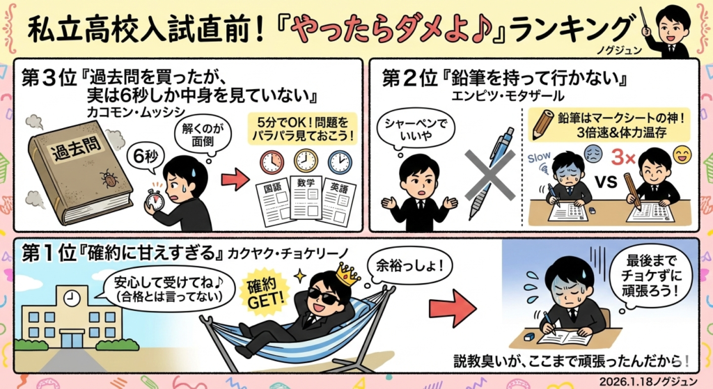 https://youtu.be/tCwwTs-GF6o 私立高校入試が目前に迫った。 「やったらダメよ♪」的な行動を ランキング形式でお送りする。 第3位「過去問を買ったが、実は6秒しか中身を見ていない」カコモン・ムッシッシ とりあえず買ってみたという心意気はいい。 解...